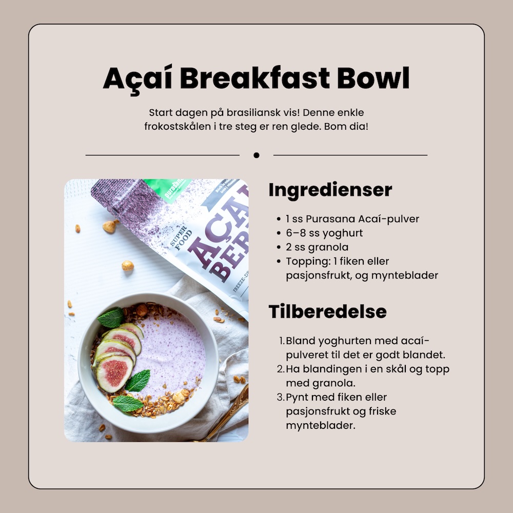 Acaibær er næringsrike bær fra Amazonas, kjent for sitt høye innhold av antioksidanter, vitaminer og mineraler. Purasana acaipulver er frysetørket for å bevare næringsstoffene og passer perfekt i smoothies, bowls og shakes.