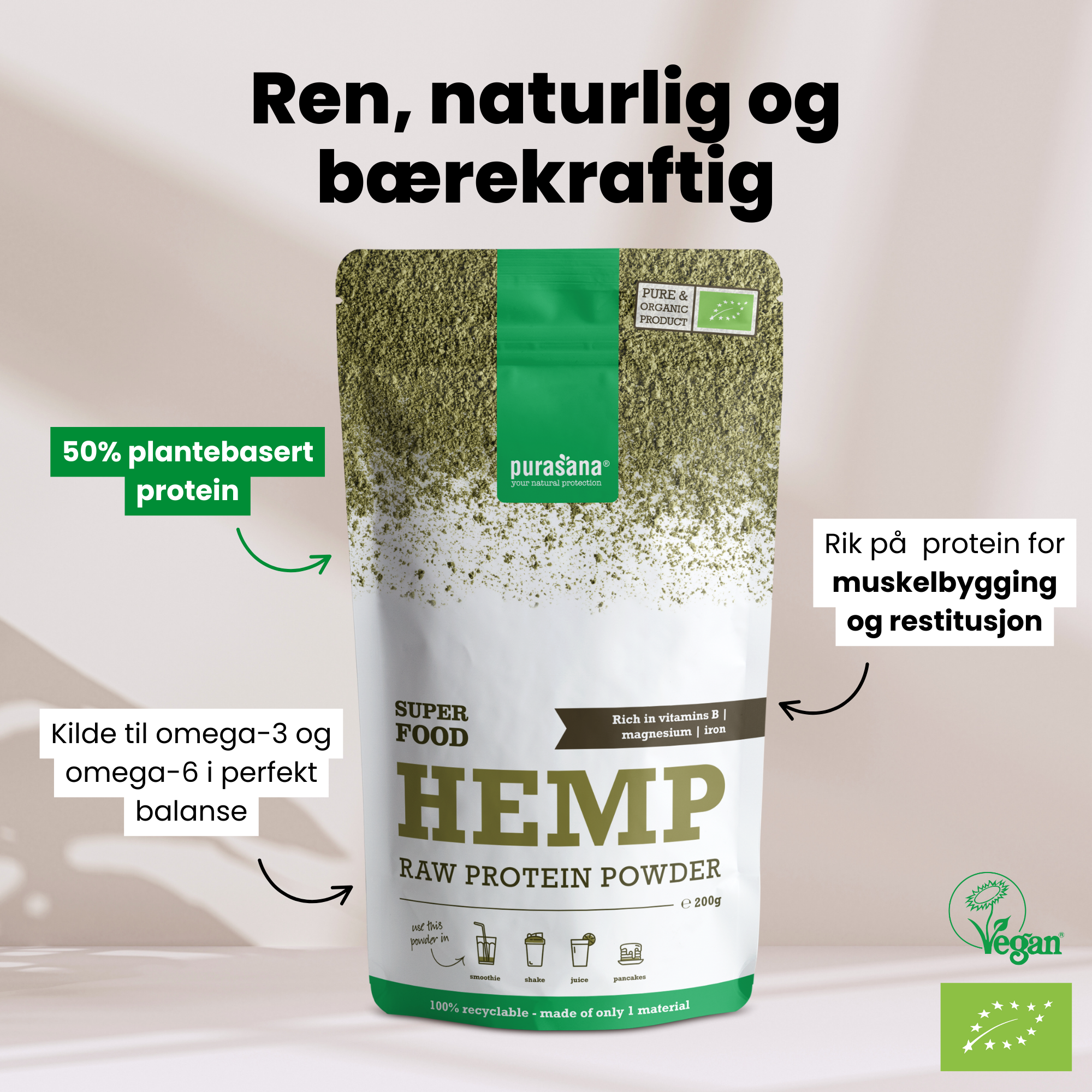 Hamp proteinpulver er en vegetabilsk proteinkilde rik på fiber, vitaminer og plantenæringsstoffer. Purasana hamp proteinpulver er uten tilsetningsstoffer og kan enkelt blandes i smoothies, grøt og bakst.