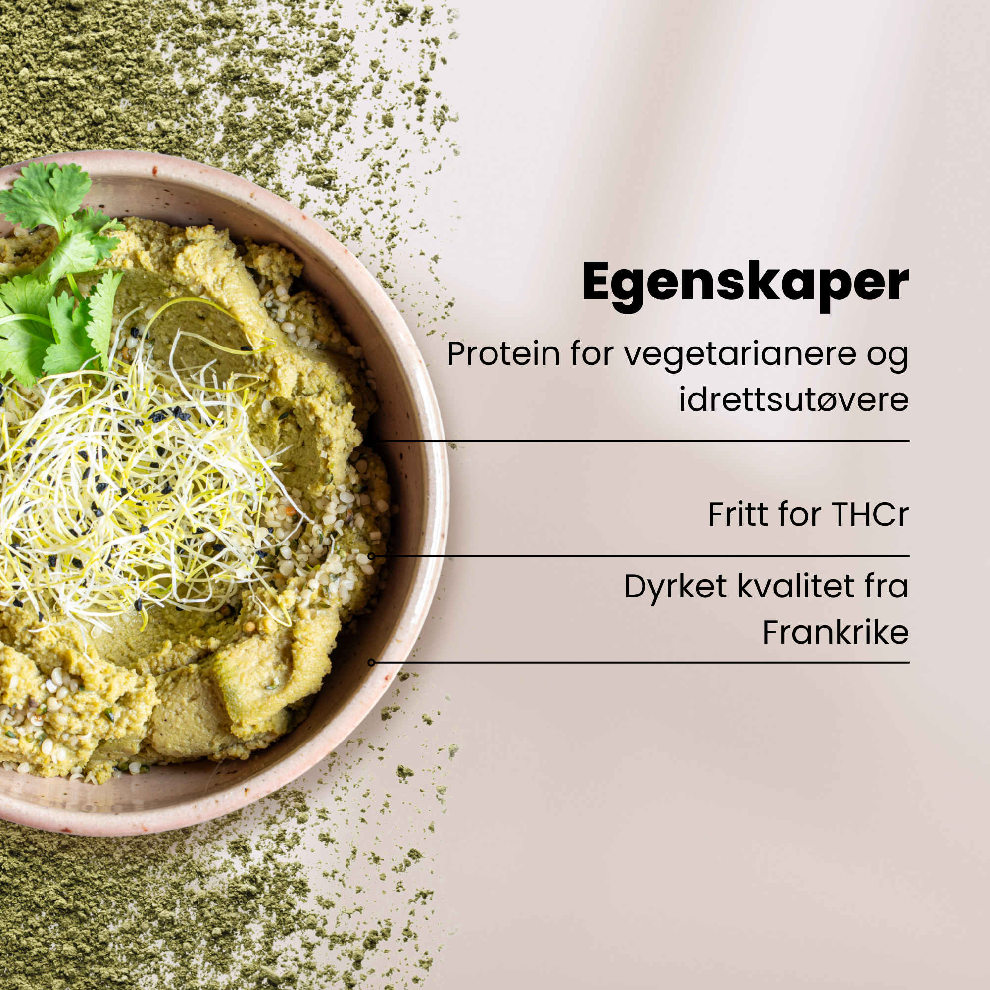 Vegetabilsk proteinpulver av hemp med et høyt innhold protein, fiber og omega-3.