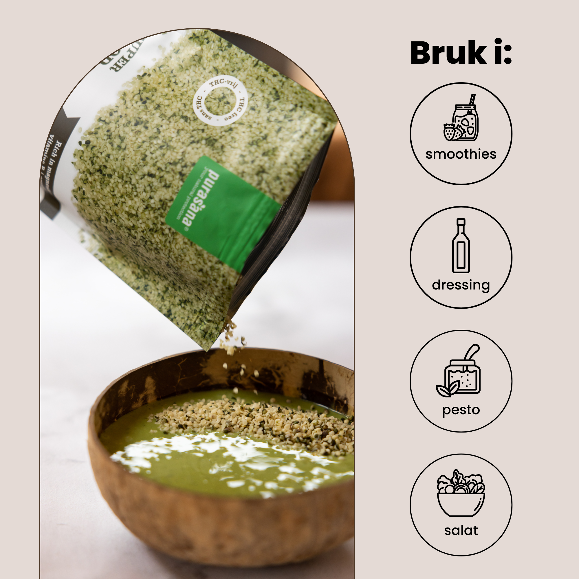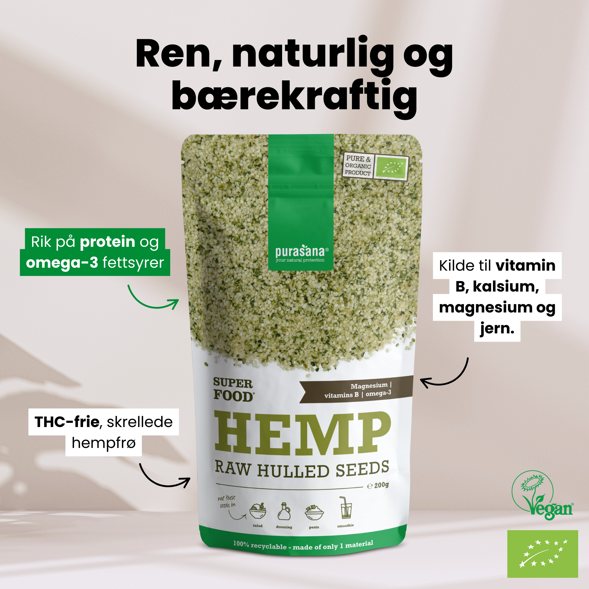 Purasana avskallede hampfrø er rike på protein, fiber og viktige næringsstoffer. De er enkle å bruke og passer godt i alt fra frokost og salater til smoothies og bakst.