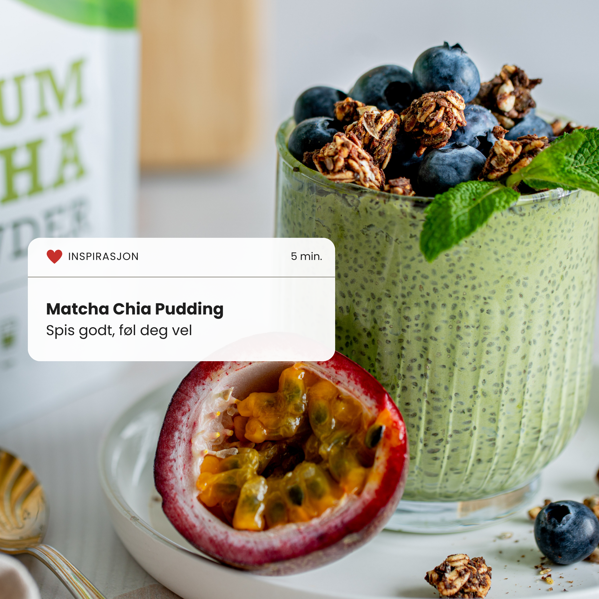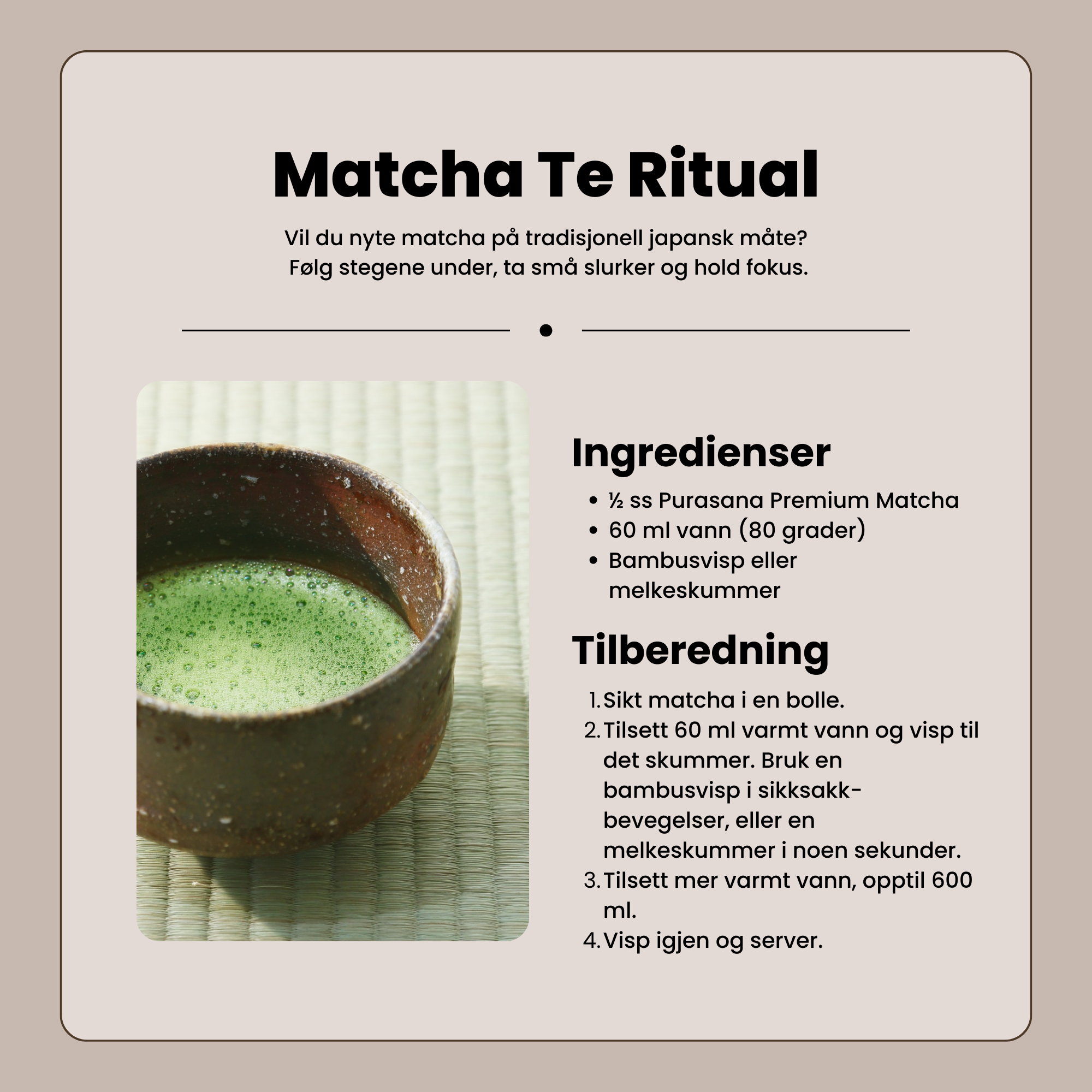 Tilsett 3 g matchapulver i 200 ml soyamelk eller rismelk for en shake, eller 1 g i 70–100 ml lunkent vann for en oppkvikkende te. Gi smoothies, juice eller latte et ekstra løft med en skje matcha!