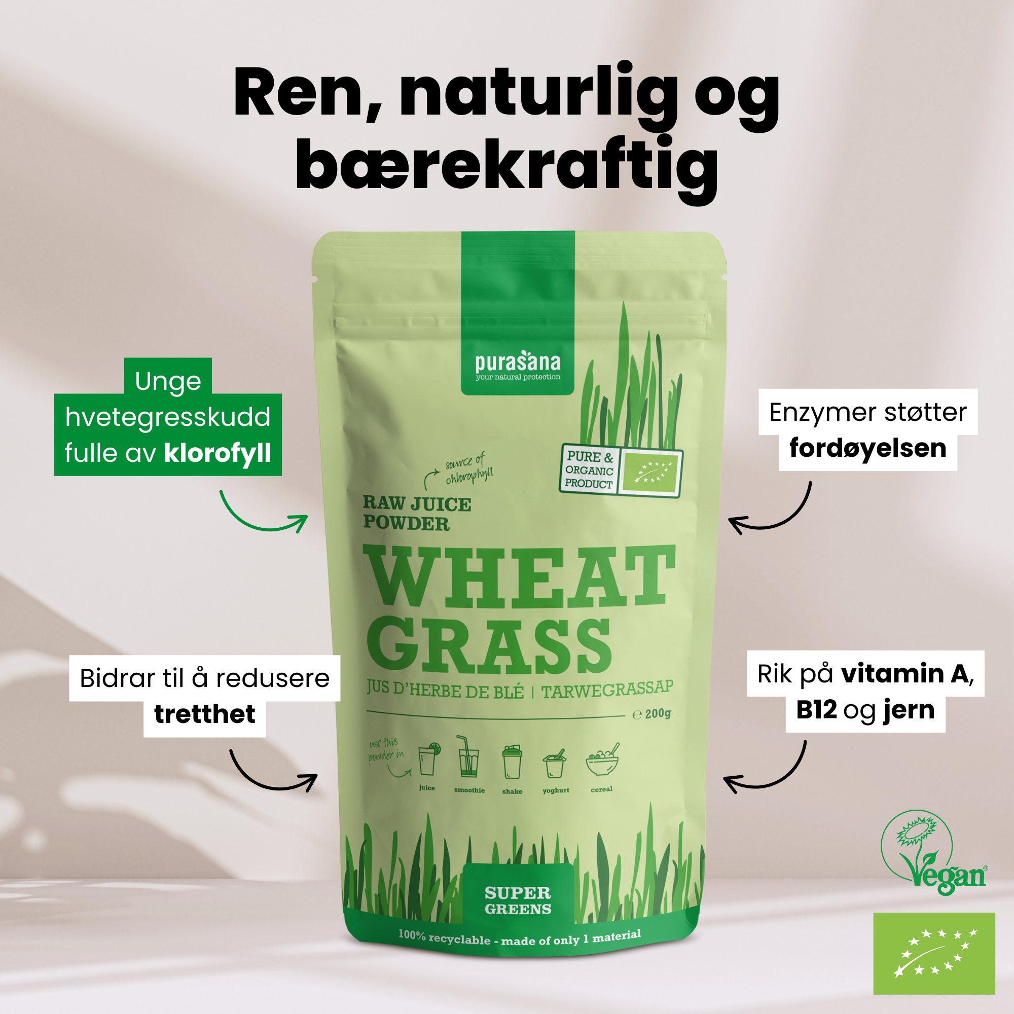 Purasana Wheat Grass Juice Powder er et rent og næringsrikt pulver laget av unge hvetegresskudd dyrket i Utah, USA. Gjennom en skånsom og bærekraftig prosess blir hvetegresset kaldpresset og tørket, noe som bidrar til å bevare viktige næringsstoffer som klorofyll og enzymer, samt den naturlige fargen, smaken og kvaliteten.